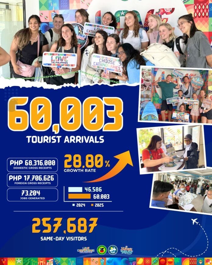 VIRAC, CATANDUANES — The Provincial Government of Catanduanes proudly announced a remarkable performance in its tourism sector, recording a total of 60,003 tourist arrivals in the second quarter of 2025. This figure marks a significant 28.80% increase compared to the 46,586 visitors during the same period last year, affirming the province’s growing popularity as a premier travel destination.