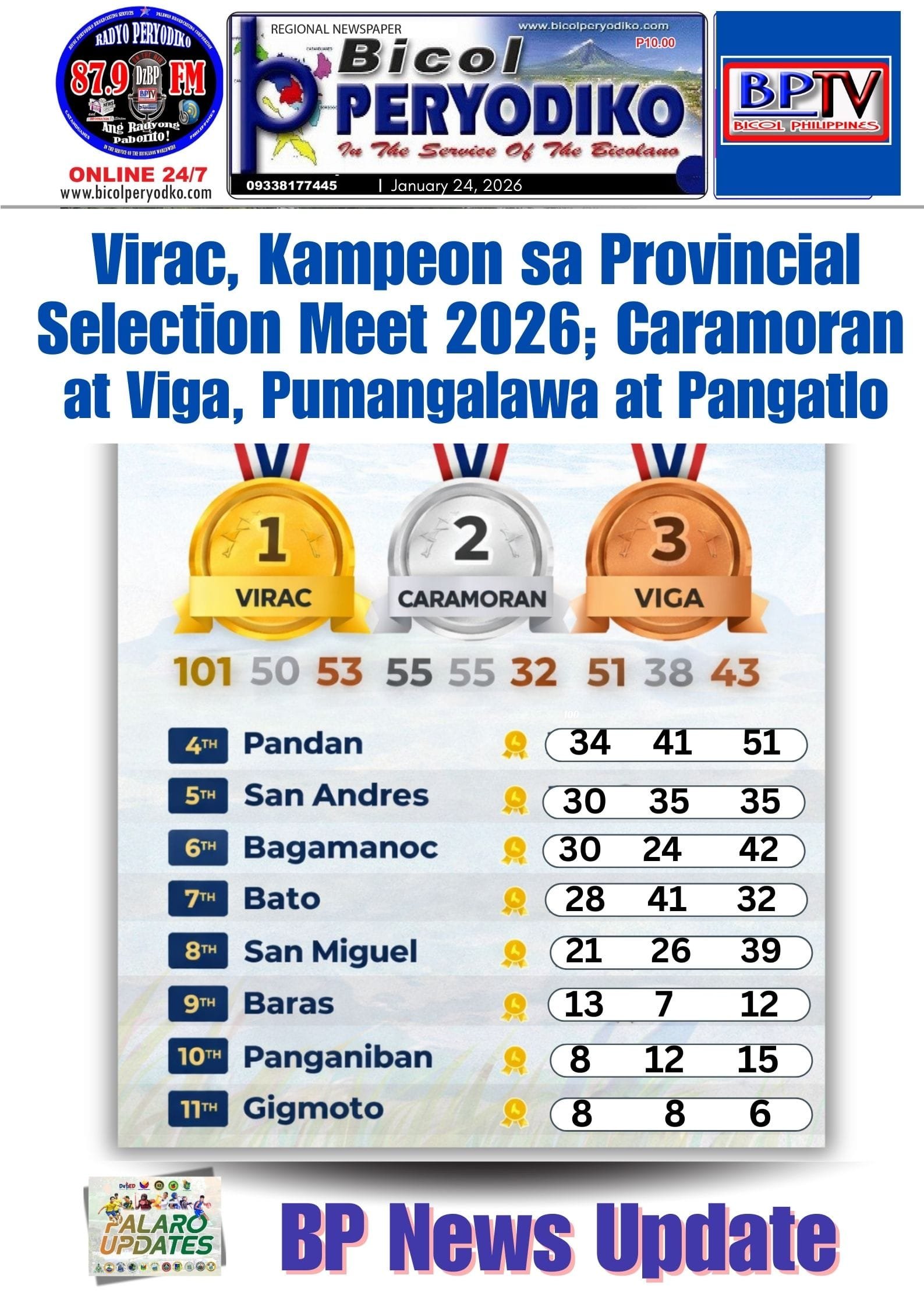 CATANDUANES — The municipality of Virac was proclaimed Over-All Champion of the Provincial Selection Meet 2026 (Regular Sports) after topping the overall medal standings against 10 other municipalities.