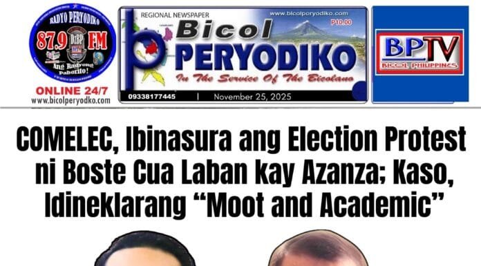 Manila, Philippines — The Commission on Elections (COMELEC) First Division has dismissed the election protest filed by former Catanduanes vice governor Peter “Boss Te” Cua against Governor Patrick Alain T. Azanza, declaring the case moot and academic.In an order dated November 24, 2025, the...